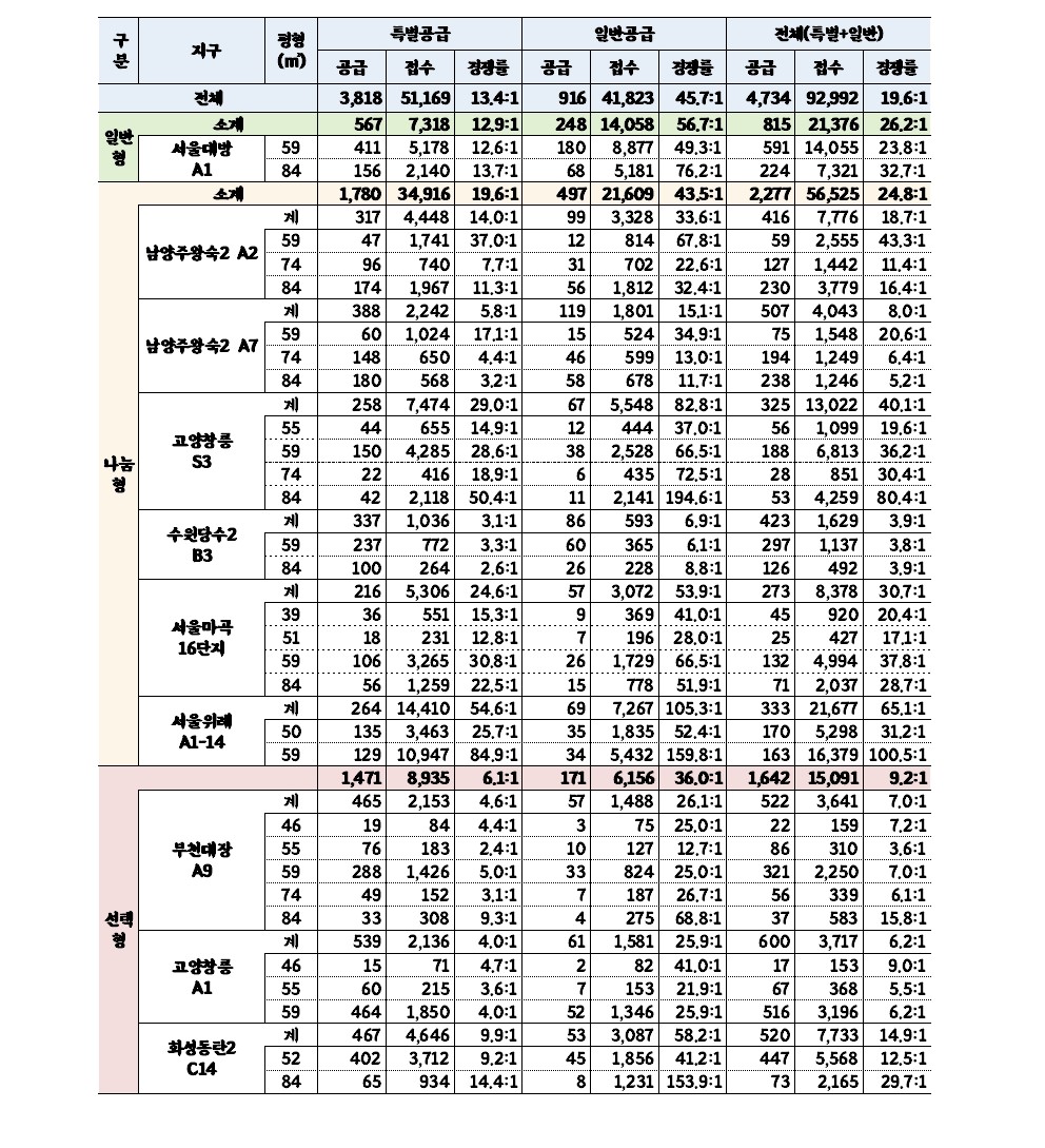 유형별로는 나눔형이 24.8대 1, 선택형이 9.2대 1, 일반형이 26.2대 1의 경쟁률을 보여 일반형이 가장 높은 경쟁률을 나타냈다. 특별공급 중에서는 청년 특별공급이 41.5대 1로 가장 높은 경쟁률을 보였다.